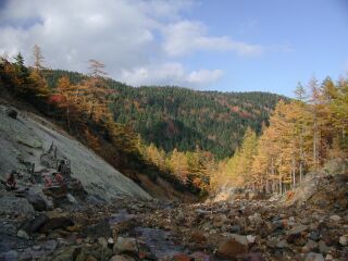 目の前に迫る雄大な硫黄岳。眼下には清冽に流れる沢。